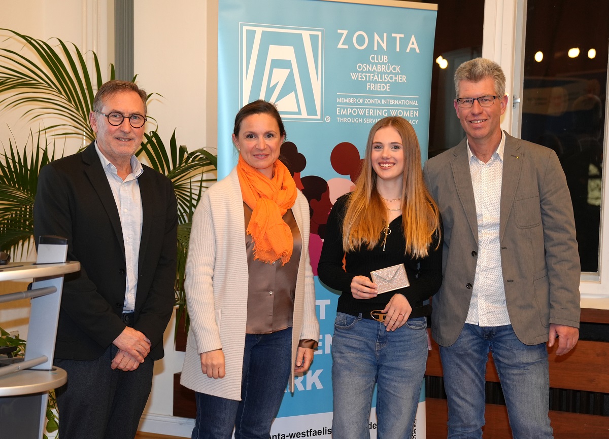 Gewinnerin Finya (13 Jahre) überzeugte die Jury mit einem Comic gegen Hass im Netz. v.l. Polizeipräsident Michael Maßmann, Zonta-Clubvorsitzende Sanja Pelletier, Schülerin Finya und Martin Schmitz Präventionsverein Osnabrück