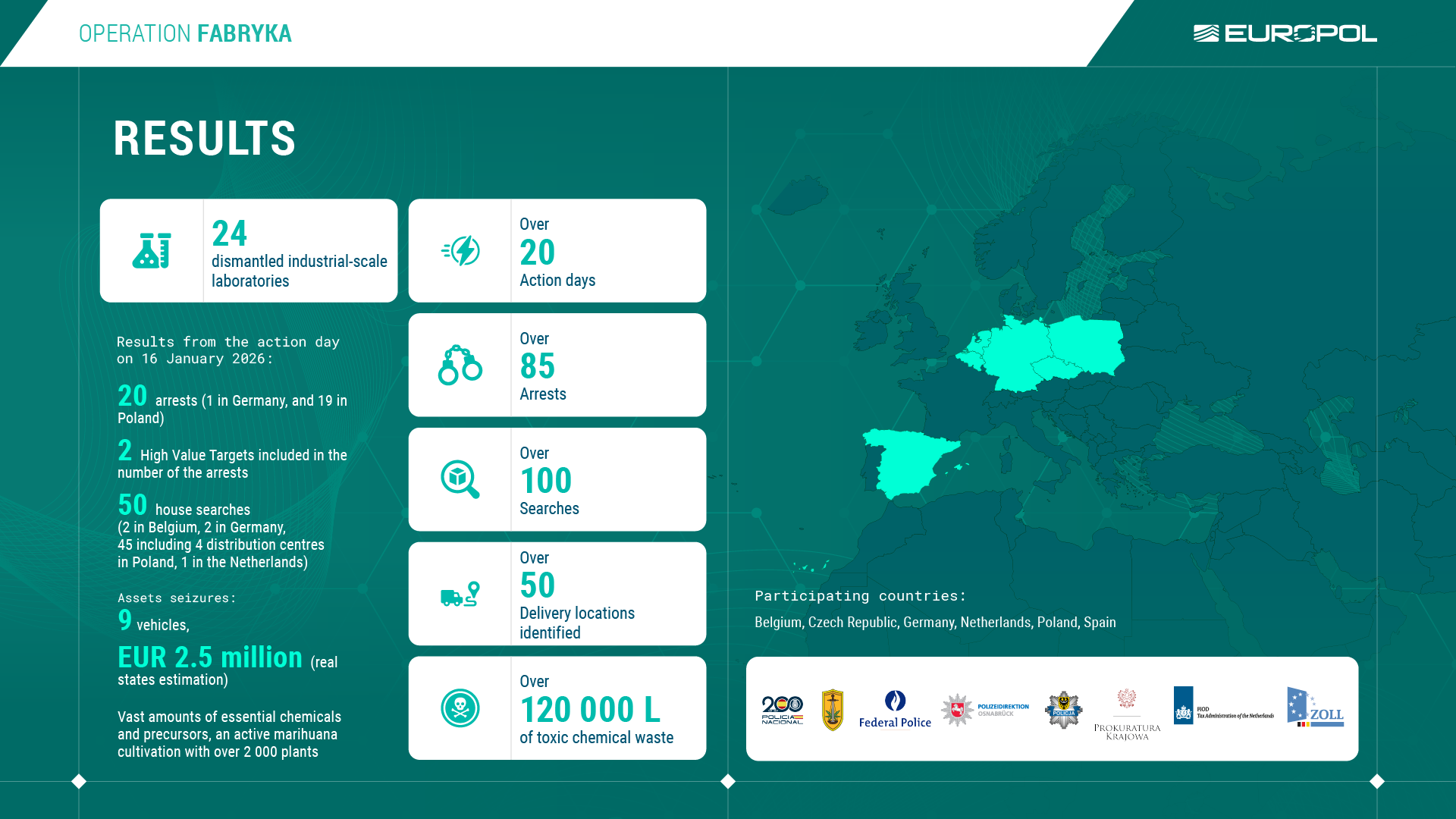 Durch engmaschige Observationen und weitere länderübergreifende verdeckte Ermittlungsmaßnahmen gelang es den beteiligten Behörden, im Verlauf des vergangenen Jahres im Rahmen der „OP Fabryka“ insgesamt 24 solcher professioneller Großlabore auszuheben, über 3,5 Tonnen synthetische Drogen sicherzustellen, 16 Zwischenlagerstätten von Chemikalien in mehreren europäischen Staaten aufzudecken und insgesamt über 85 Personen festzunehmen. Zusätzlich wurden über 1000 Tonnen Vorläufersubstanzen ermittelt und eine halbe Million Euro Bargeld sichergestellt.