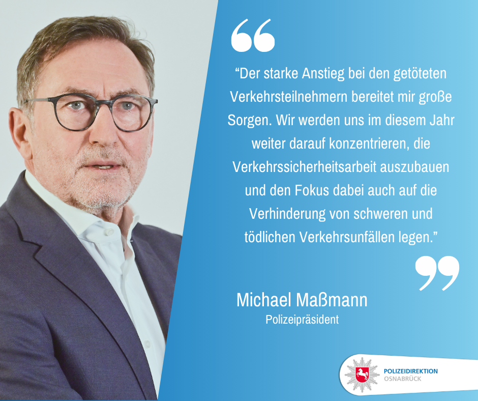 Die Anzahl der Verkehrsunfälle mit tödlich verletzten Personen ist im Zuständigkeitsbereich der PD Osnabrück im Jahr 2023 im Vergleich zum Vorjahr um 17 getötete Menschen stark angestiegen. Insgesamt ließen im Jahr 2023 97 Personen auf den Straßen ihr Leben.